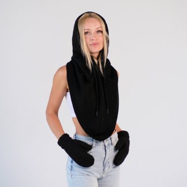 Hooded Scarf Mittens Set Cowl Womens Warm Fleece