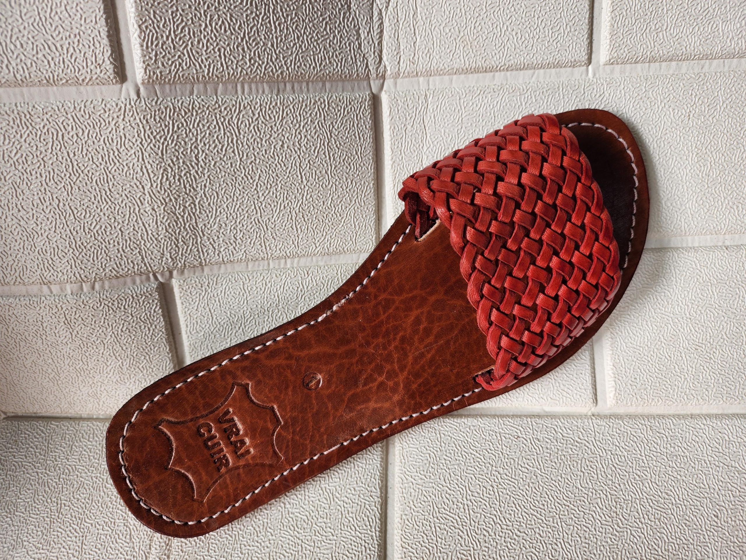 These braided slide flats feature a bold terracotta-red leather upper, tightly woven for a secure and breathable fit. The natural brown leather sole is soft, sturdy, and perfectly stitched — ideal for warm-weather days, vacation strolls, or simply feeling grounded in artisan-made quality.