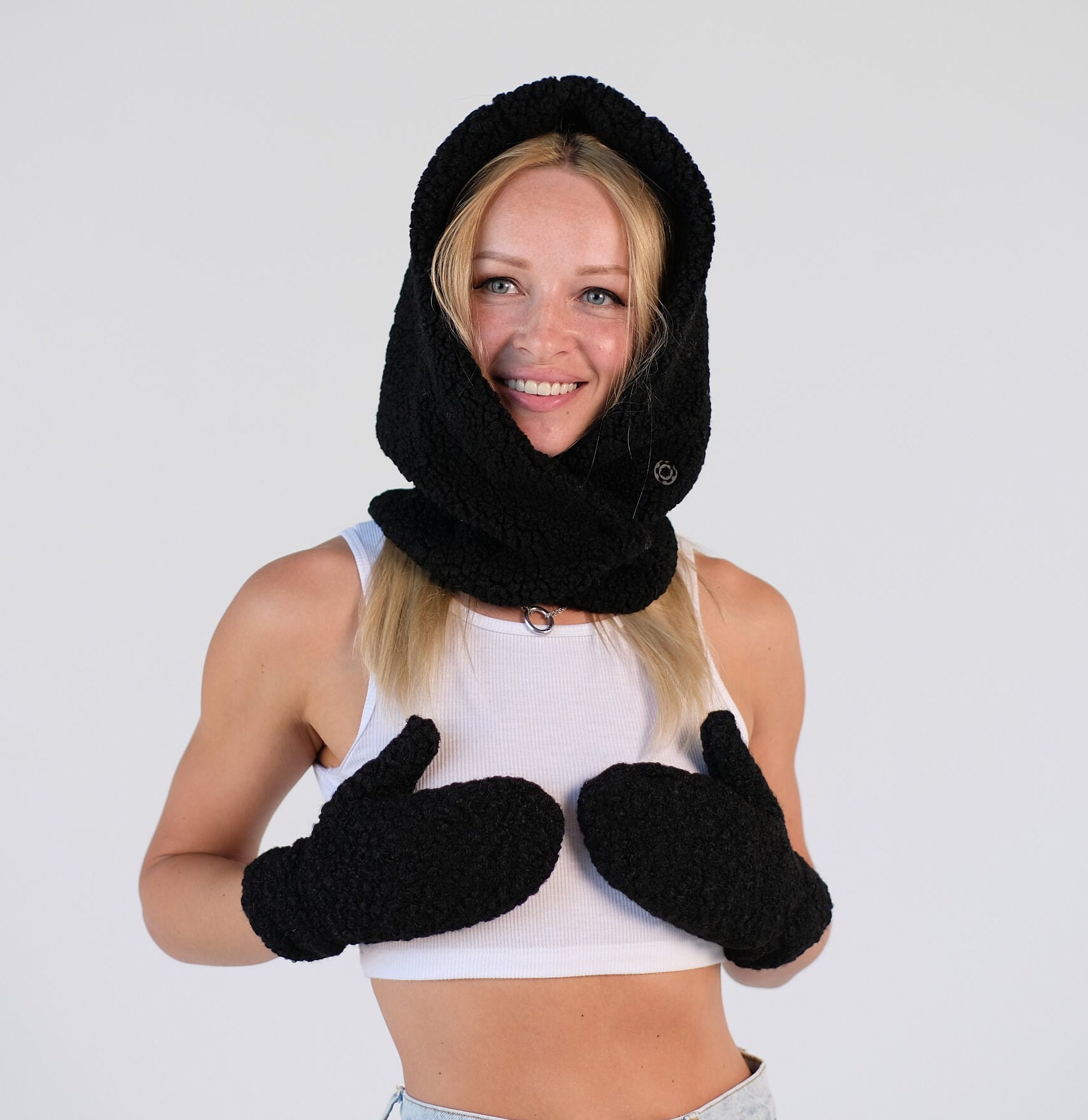 Hooded Scarf Mittens Set. Women Sherpa Set. Fleece Mittens Gloves. Hooded Cowl. Winter Warm Set. Trending Now. Christmas Gift for Her