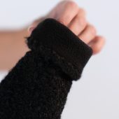 The top of the hood is teddy plush; the inner part – is fleece lining. The hood has three invisible buttons for fastening. which can be fastened tighter or looser.