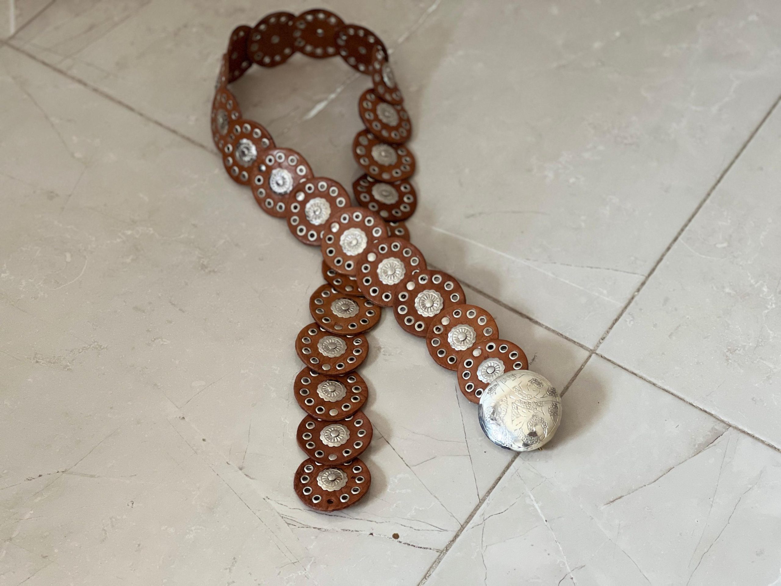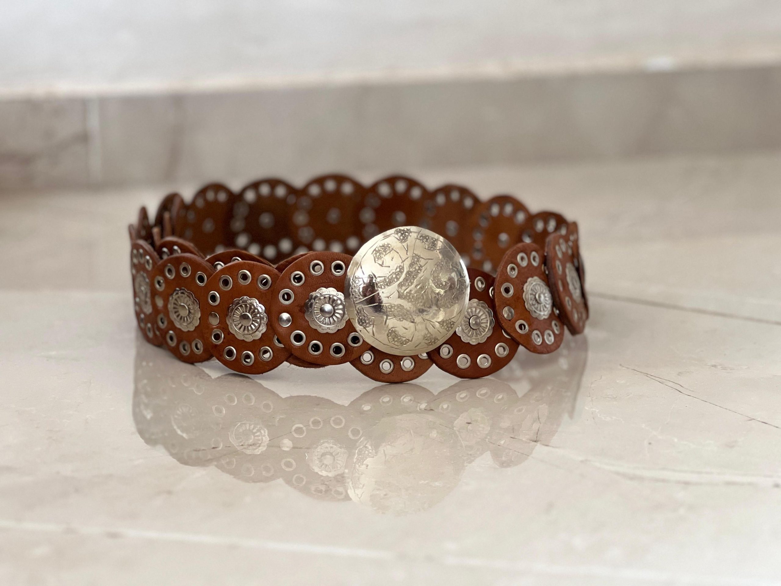 🎁 Searching for a special gift? This handmade leather concho belt (110 cm / 43.3 in) blends timeless charm with bold style. Its vintage round concho design and engraved buckle make it perfect as a medieval belt, a studded waist belt, or even a unique halloween costume belt.