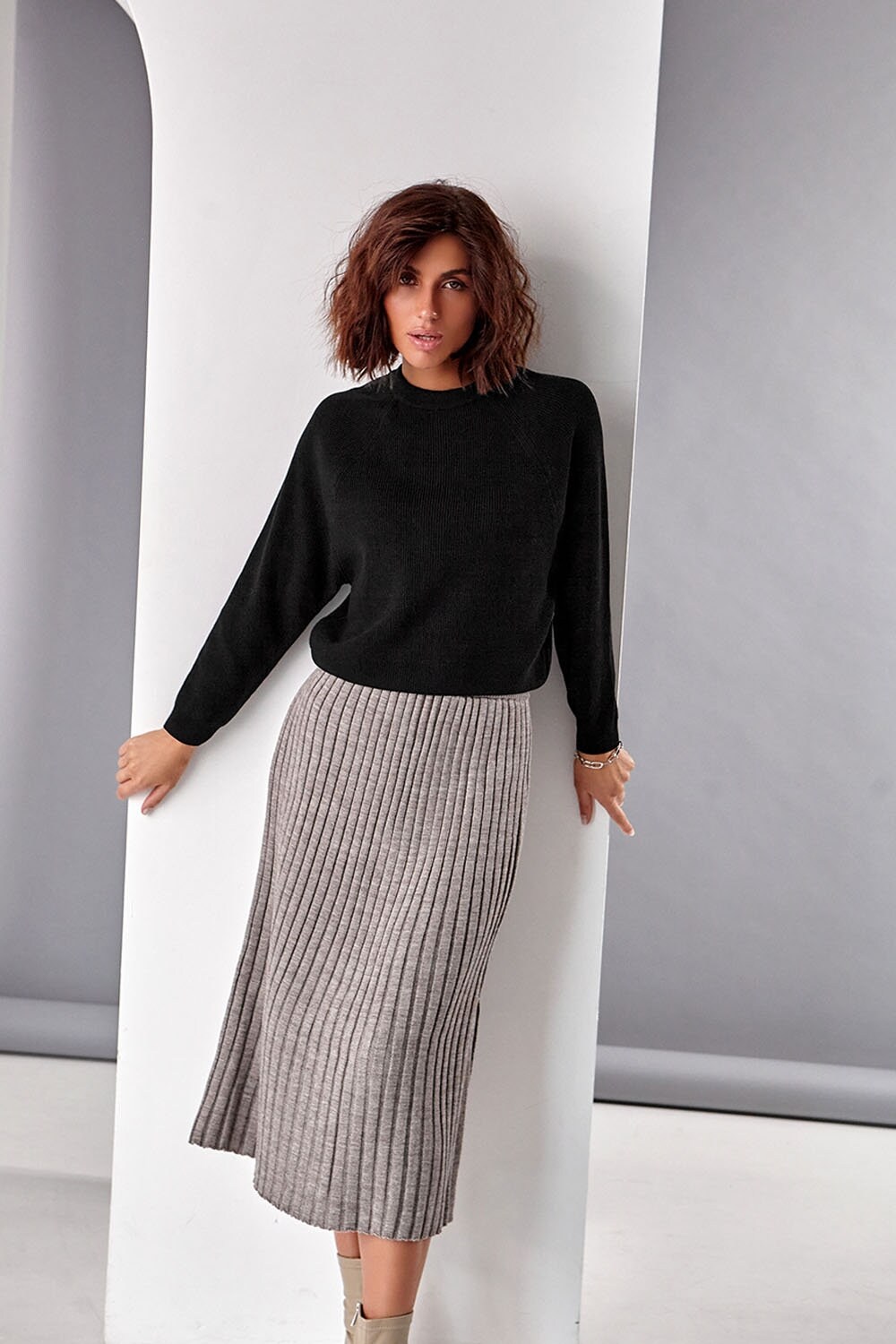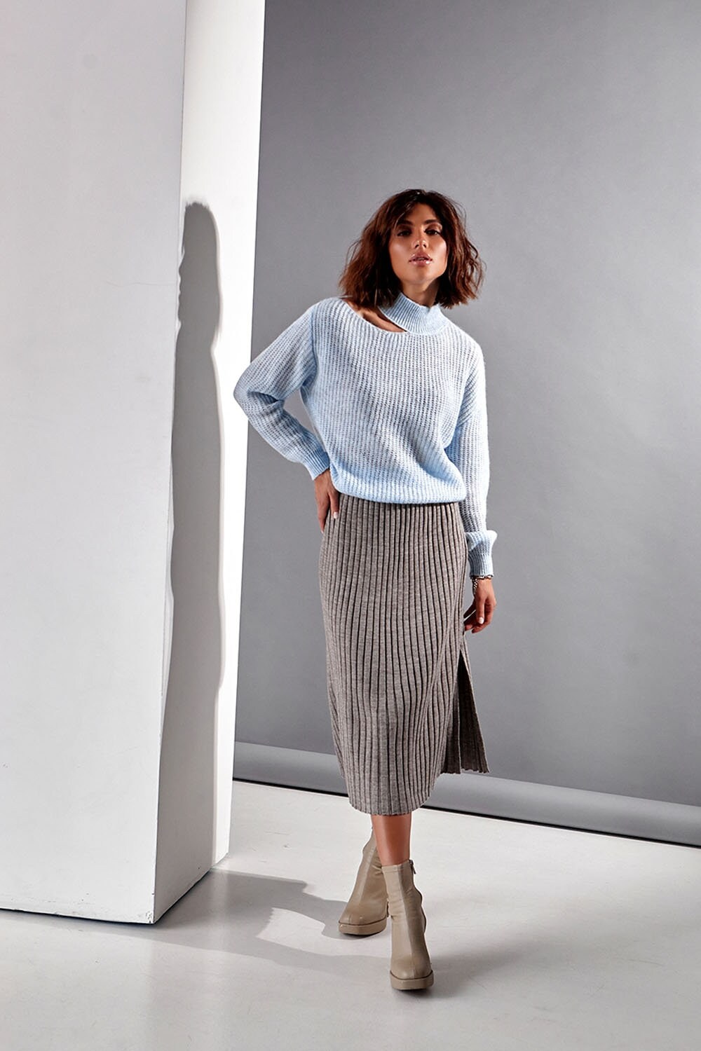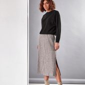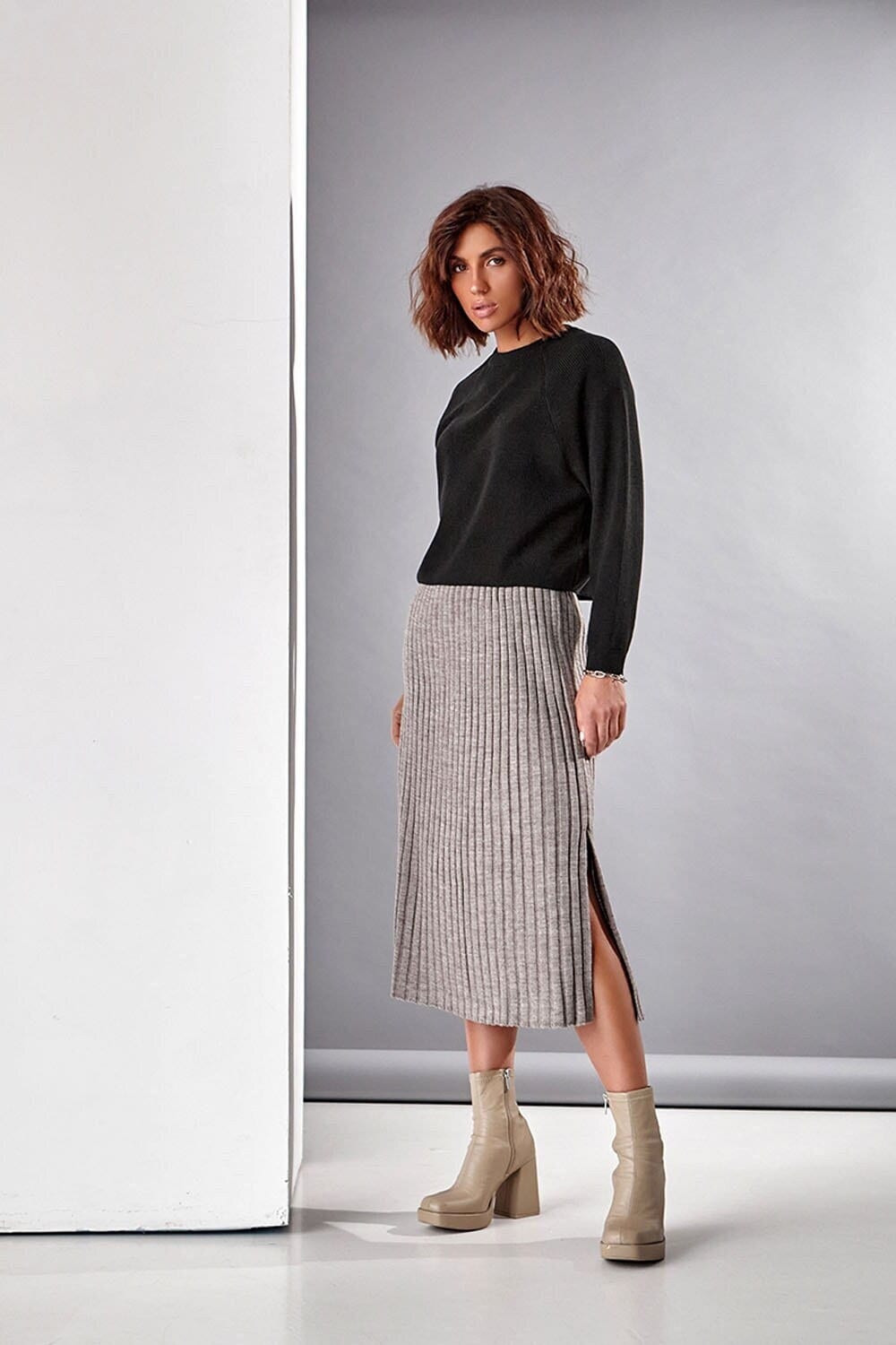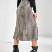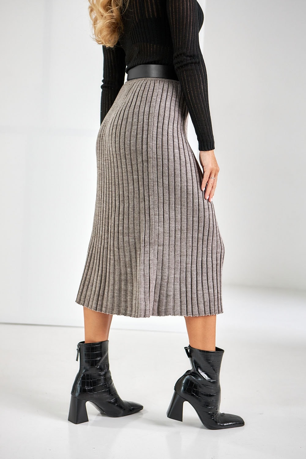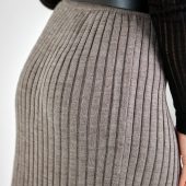 Knitted midi skirt with a slight trapeze silhouette made of half-wool yarn. The skirt is made in an elastic. shape-holding medium-density weave. The model has a vertical side cut. The waist is accentuated by a wide elastic belt.